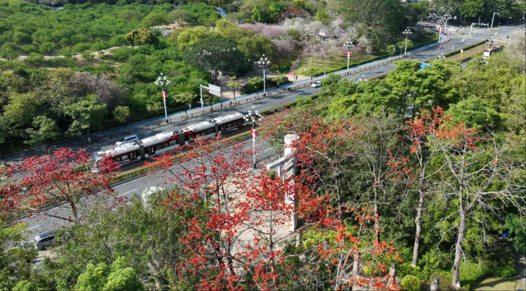 City Avenues & Parks: Along Kaifa Avenue, Xiangxue 3rd Road, and Kaichuang Avenue, as well as within the Civic Square and Entrepreneurship Park, tall and proud kapok trees hold aloft their canopies of vibrant red blooms.
