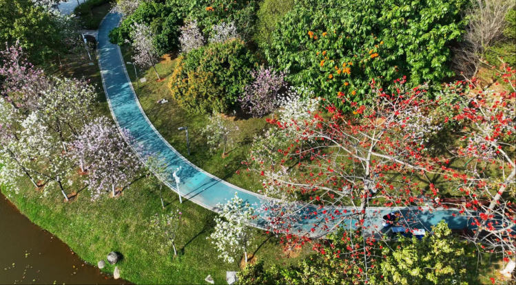 The Civic Square follows the natural contours of the hills and waters, where the orchid trees and green plums bloom in succession as young parents stroll by pushing strollers. In Shankengding Park, retired teachers bring their sketchboards to paint the over 600 Golden Trumpet Trees that turn the hillside into a golden wonderland and blanket the wooden boardwalks with fallen petals. Meanwhile, the Development Park uses water as its core feature, with lotus, calamus, and iris dotting the stream to create the unique "Wetland Floral Stream."